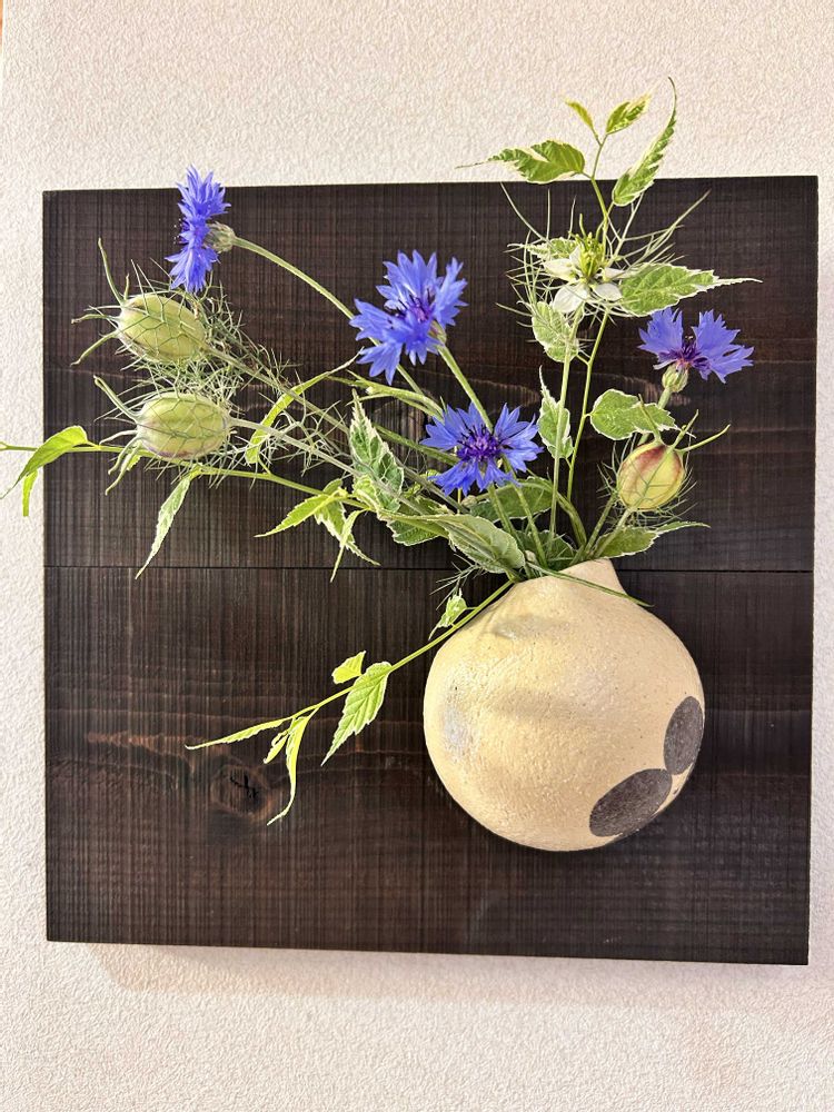 …矢車菊だけではなんとなく寂しかったので、庭にあったニゲラの鞘や班入りヤマブキの葉っぱと一緒に、花瓶やいつもの掛け花入に飾りました🌸