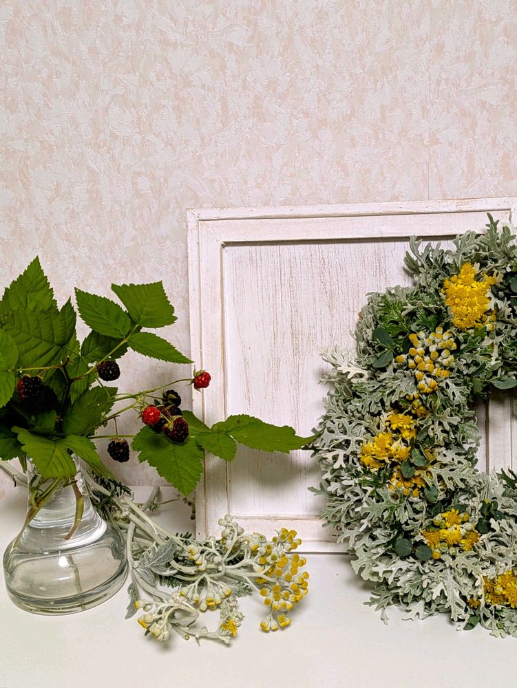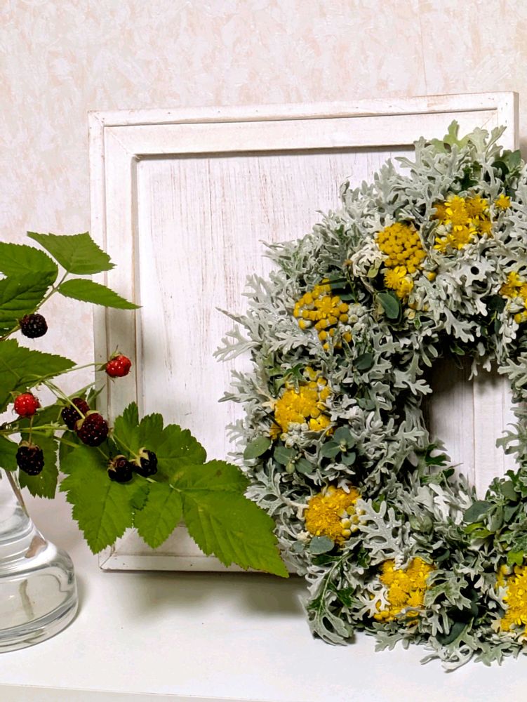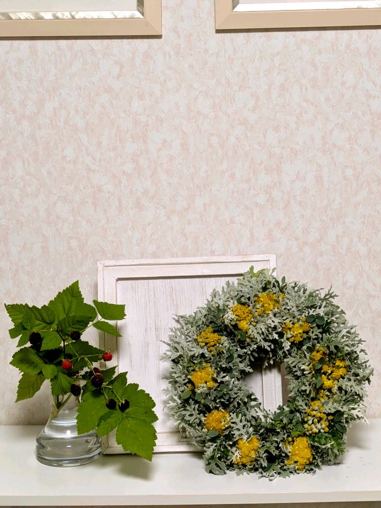 シロタエギクのリース!お花も使ってシンプルナチュラル💚ドライになる経過も楽しめて素敵です😊💓