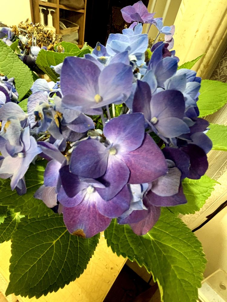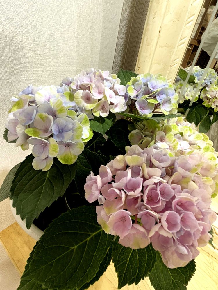 大きな鏡🪞のチェストの上に綺麗なアジサイの鉢🪴を置いてて、許可を取り撮らせてもらいました。