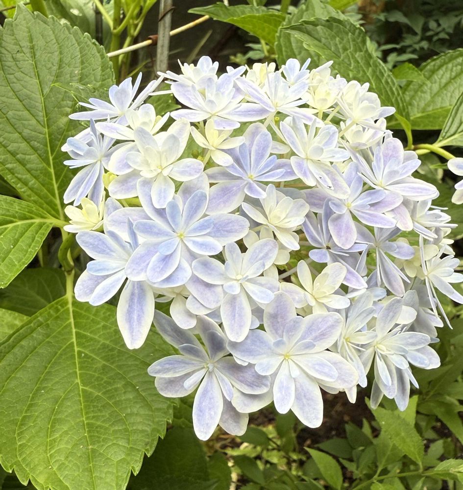 1枚めは昨年の挿木。何のアジサイだか忘れていたものが咲いて、万華鏡と判明。ただ、花茎が柔らかすぎて項垂れていたので切花に。