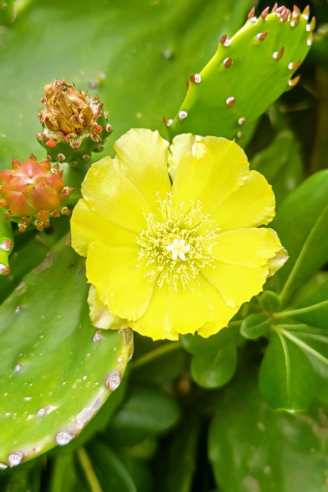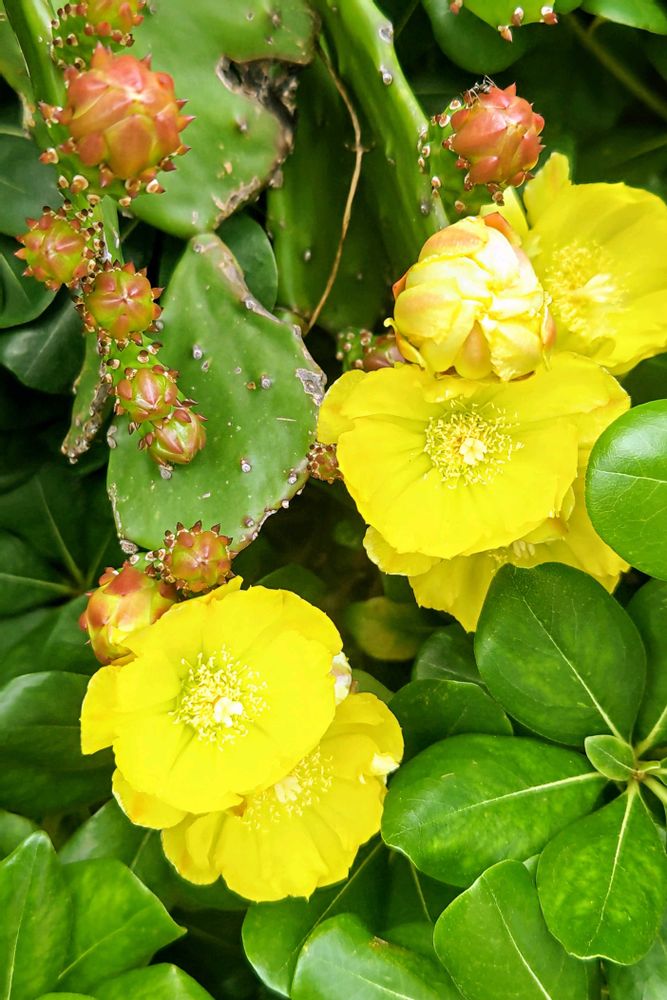 街路樹のしたの植え込みで咲いたウチワサボテンの花。