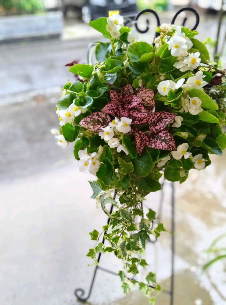 ピポエステス?の葉色とベコニアの葉っぱの緑と白い花がマッチしてて私は大好きだなぁ