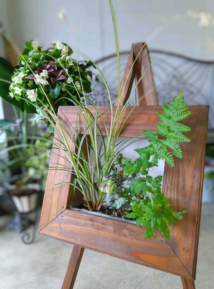 夏の額縁、家にあるシダとクロロフィツム スターライト(オリズルラン属)と、待機苗で枯れそうになってたオレガノで飾ってみました🖼️