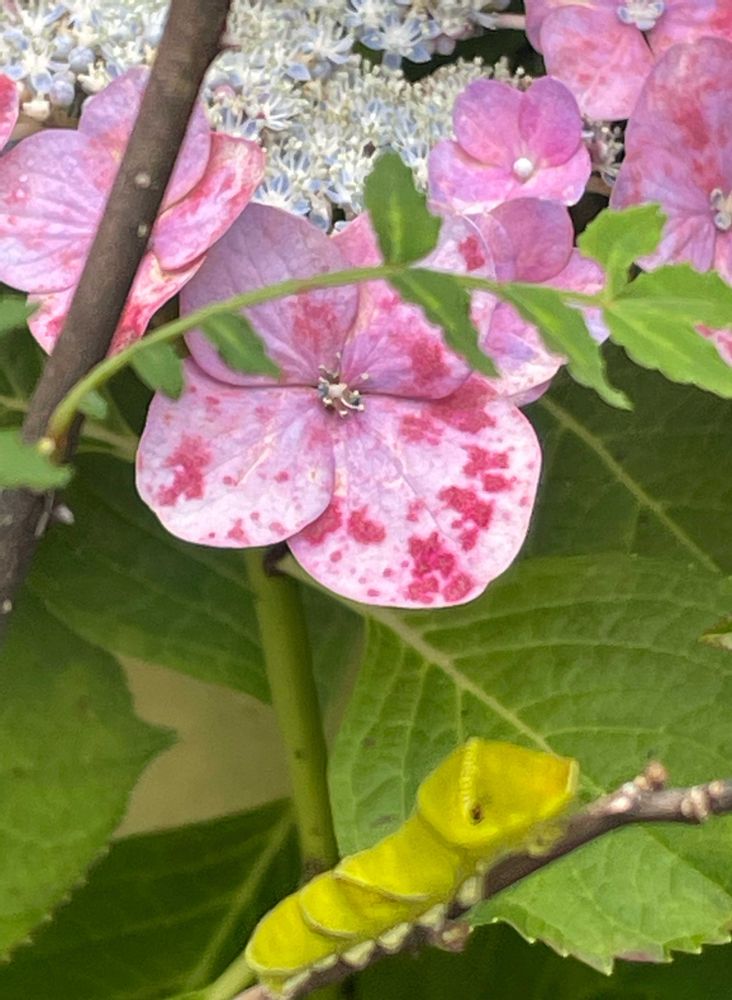 ガクアジサイの下の山椒。あれ?葉っぱ無くなってるなぁ。…と思いきや …うーん😓、ちっさな芋虫。いいか、蝶になるまで見届けるよ。