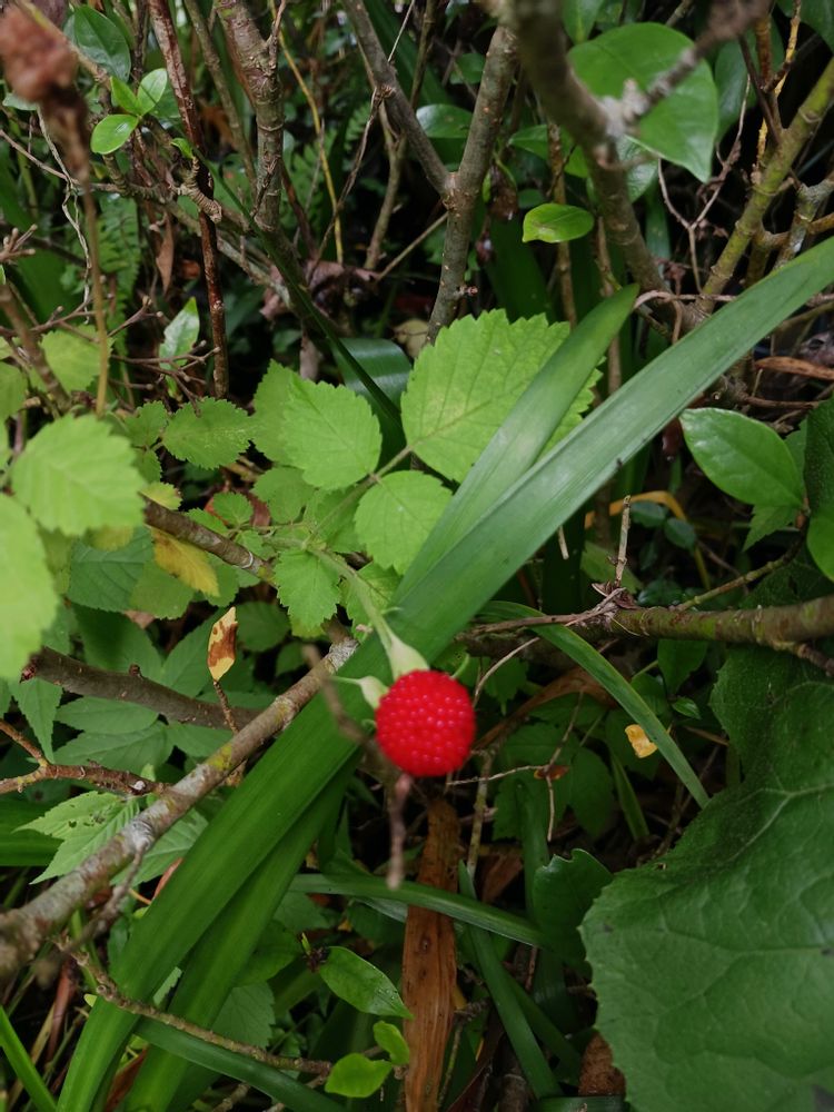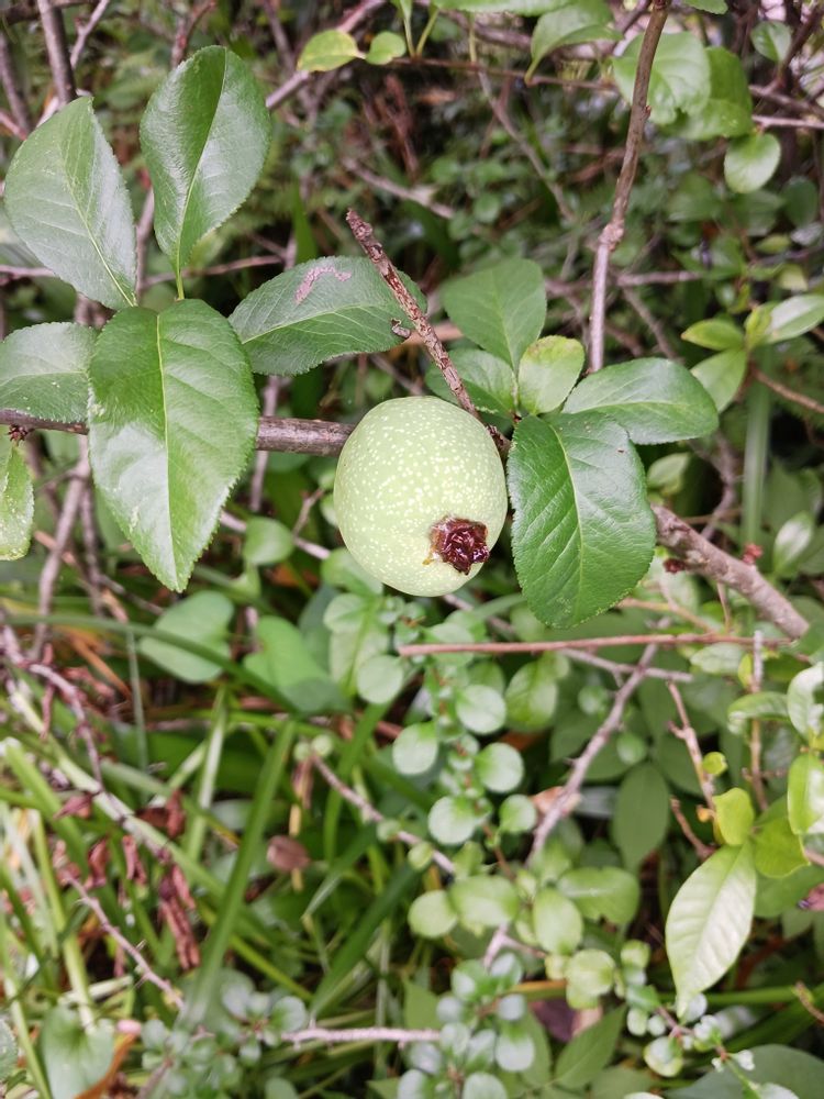 クチナシのお花が見たくて庭の中に入りましたがまだのようです。ボケの実と草イチゴが撮れました♪