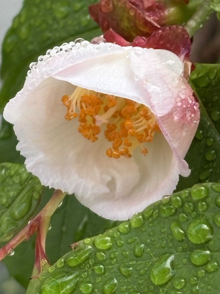 今朝、霧雨状の雨が降っていたので、花や葉っぱに水滴が可愛かったです😊