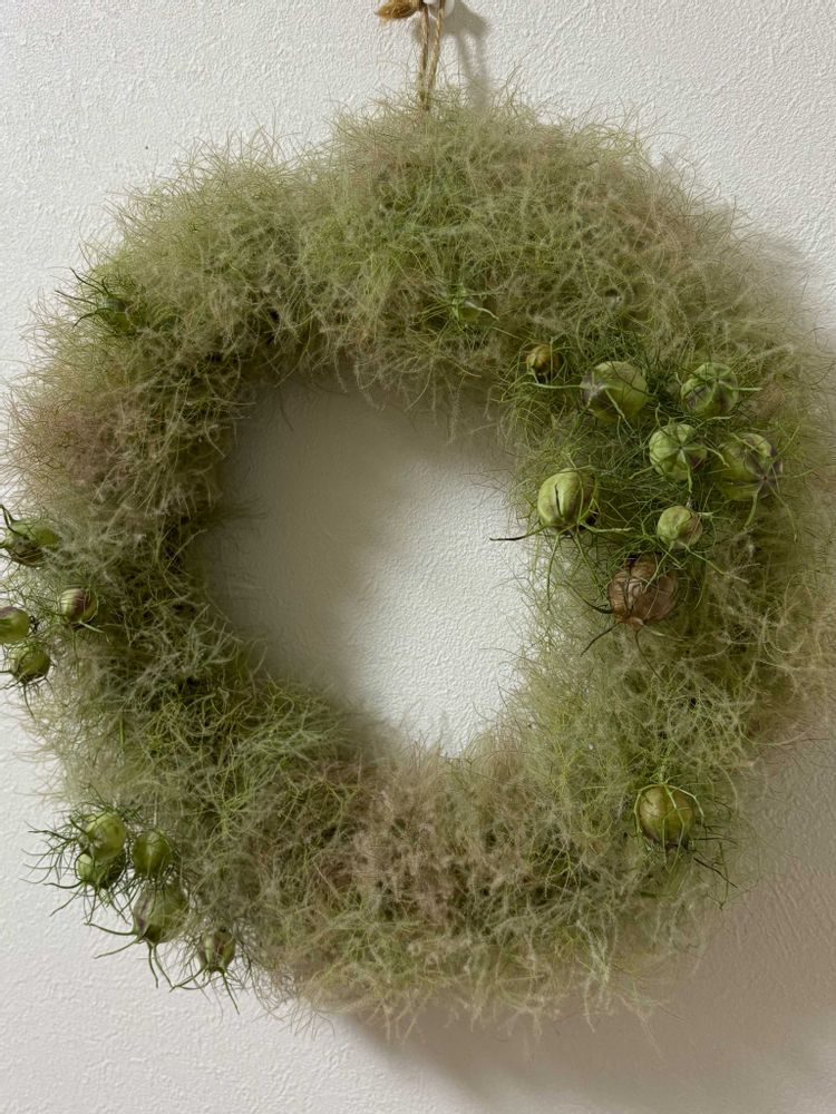 スモークツリーをたくさん頂いたのでリースを作ってみました 土台のリースが大きかったのでがっしりしました😅時計草は去年から冬越し出来ました❣️チョコレートコスモスは一回りおおきな株になり嬉しいです💕ヒューケラは鉢一杯になり株立ちして来たので株分けしました🍀