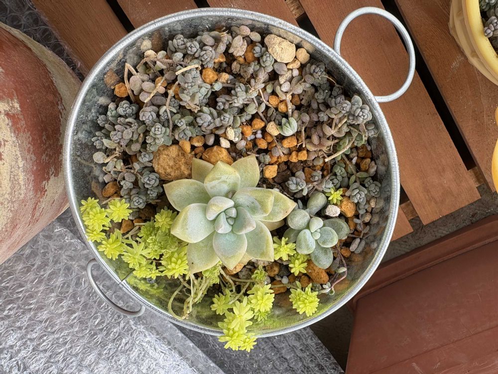 多肉マニアの奥様に多肉と缶を貰って、初めて寄せ植えしてみた。