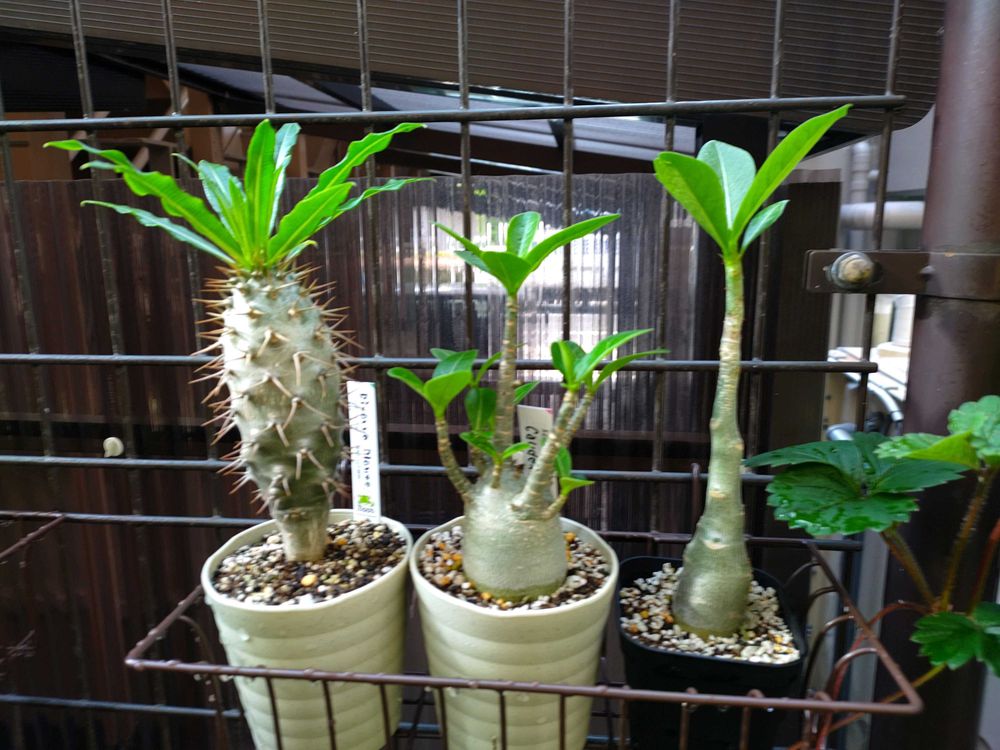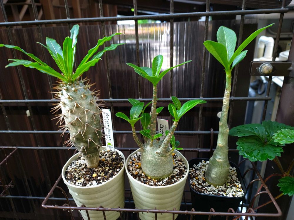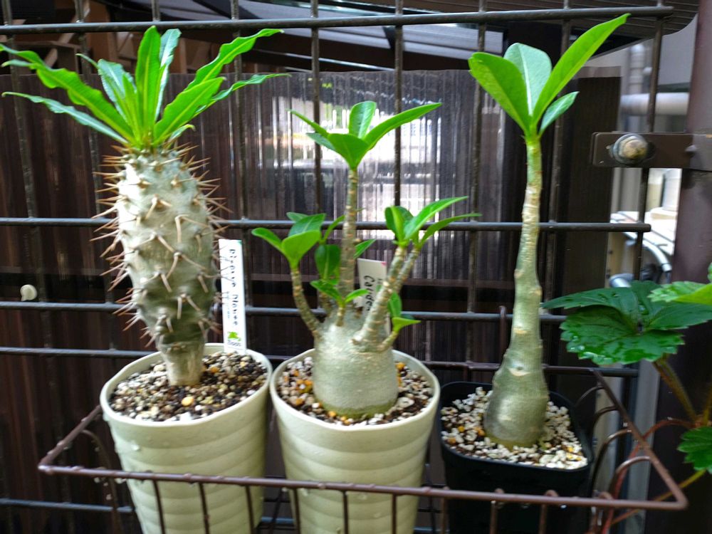 冬に室内管理して、葉が落ちて丸坊主になっていた、右からアデニウム・オベスムとアデニウム・アラビカムとパキポディウム・ラモスム😊
