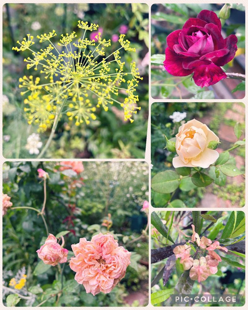 花火のようなディルの花と ピンクになってきたドドナエアの鞘と 薔薇🌹