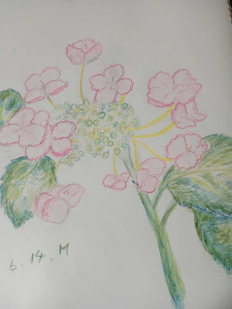 退院して、久しぶりに色彩色鉛筆画を描いてみました。我が家のガクアジサイ(自己流)