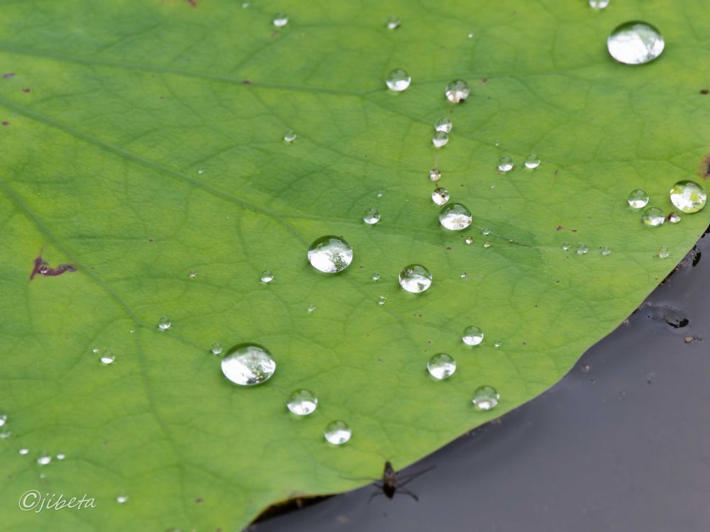 雨上がり、ハスの葉の上で水玉が踊っていました。