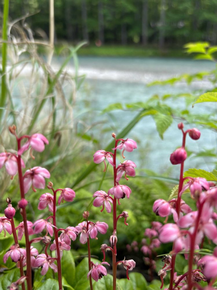 ベニバナイチヤクソウが咲き誇る梓川の岸辺