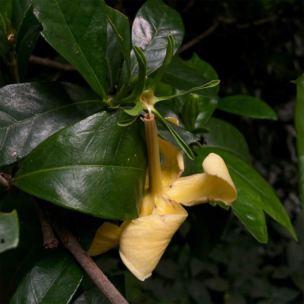 甘い香りに誘われて近寄ってみたところ、黄色に変色した朽ちかけのクチナシを見て驚きました。1本の細い管(花粉を運ぶための管でしょうか)が花の落下を食い止めており、その剥き出しの状態になった管の原始的な姿に動揺してしまったのです。