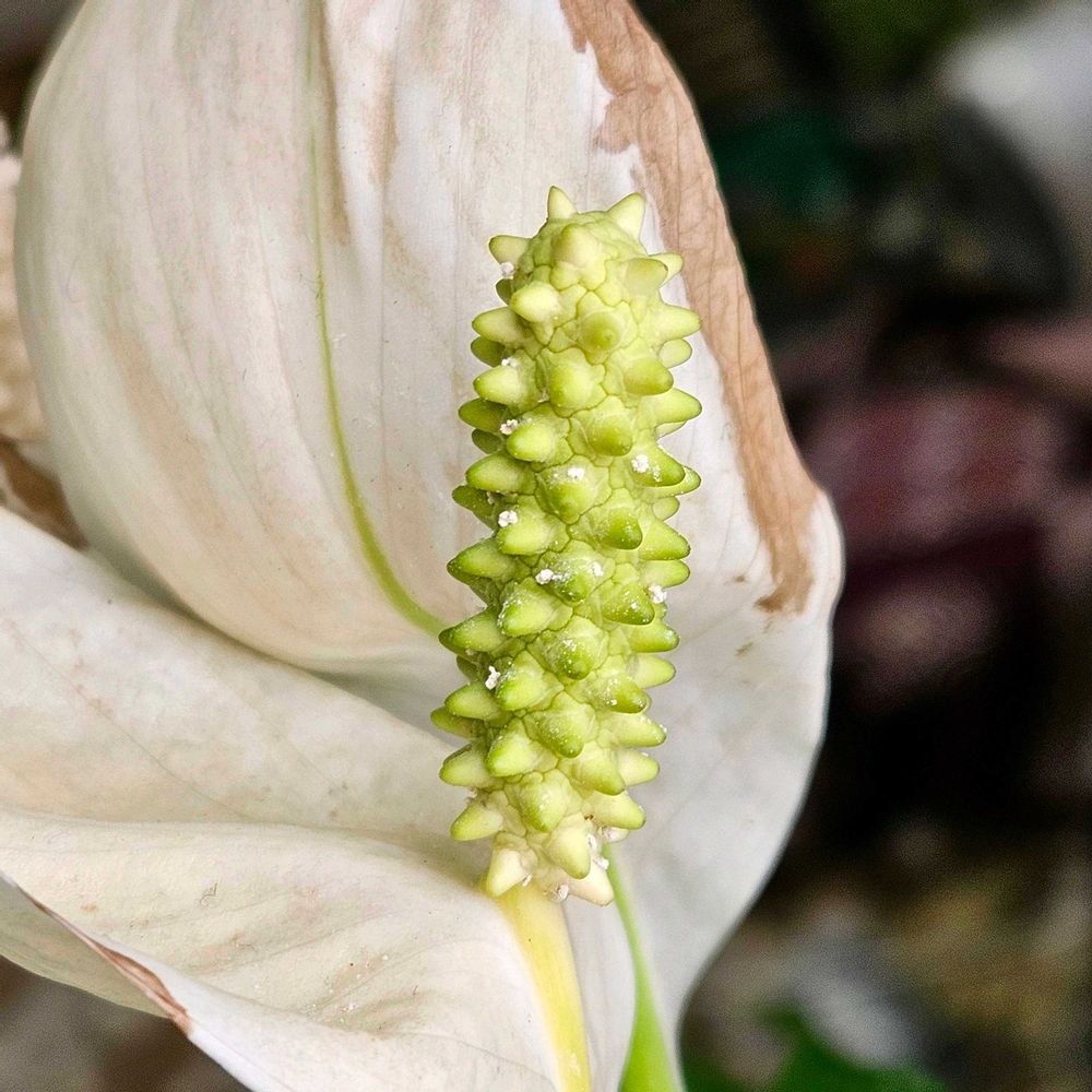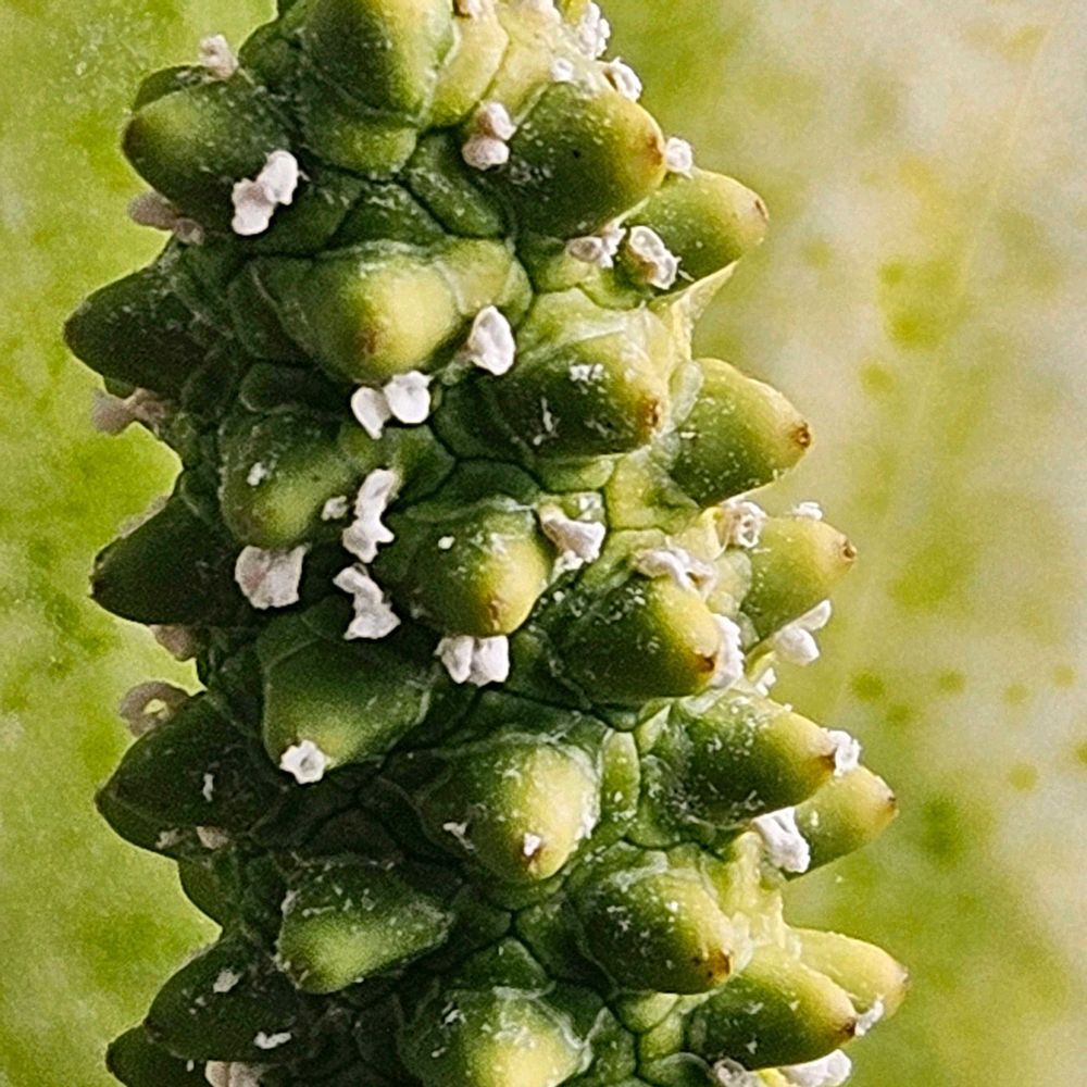 ・苞の内側にある棒状肉穂花序に花が多数付く 粒状の小さな花