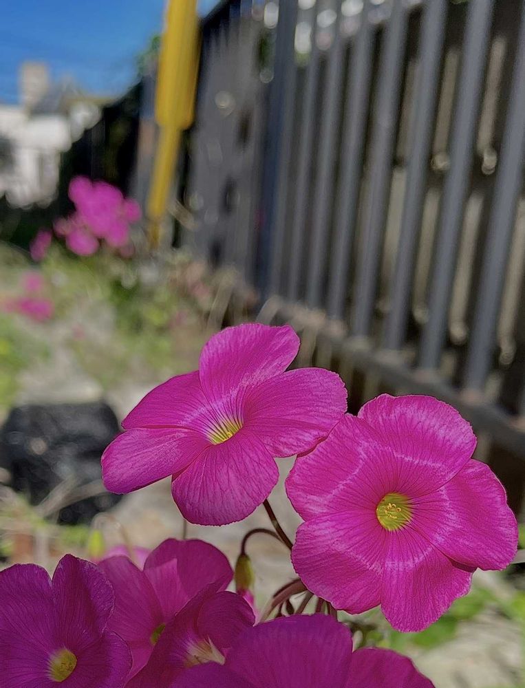 ムラサキカタバミと思うんだけど、庭のあちこちに咲いてるのを見かけると、かれんでかわいい花だけど、増えると大変なので、引いてるよ。繁殖するね^_^