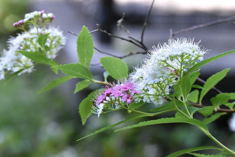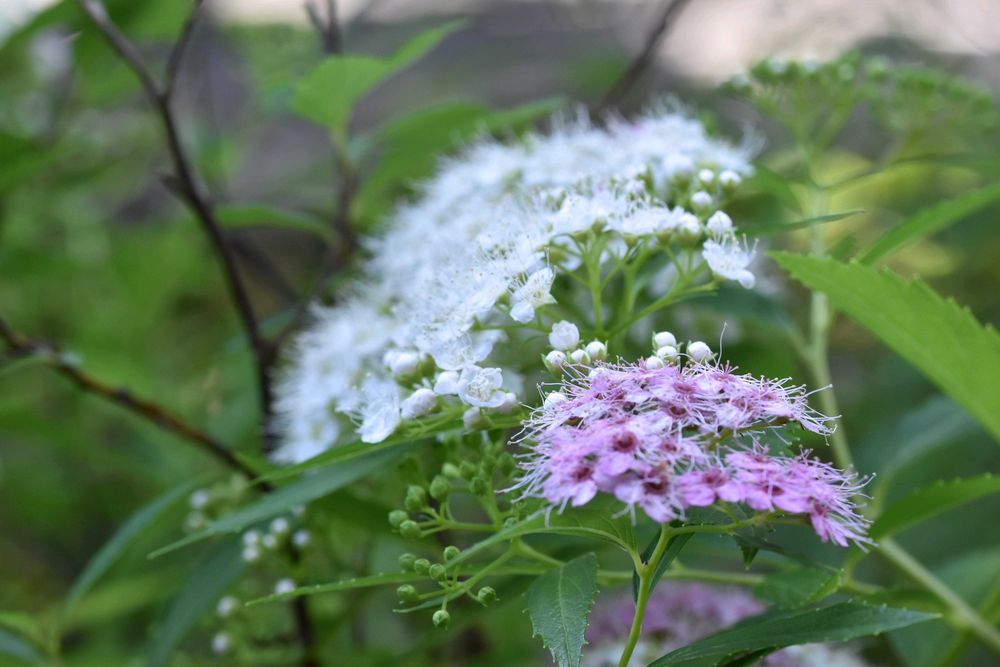 シモツケの園芸品種、一株から白と淡紅色の花を咲き分ける。「ゲンペイ」の名前は、紅白の花色を源平の旗色に見立てたもの。