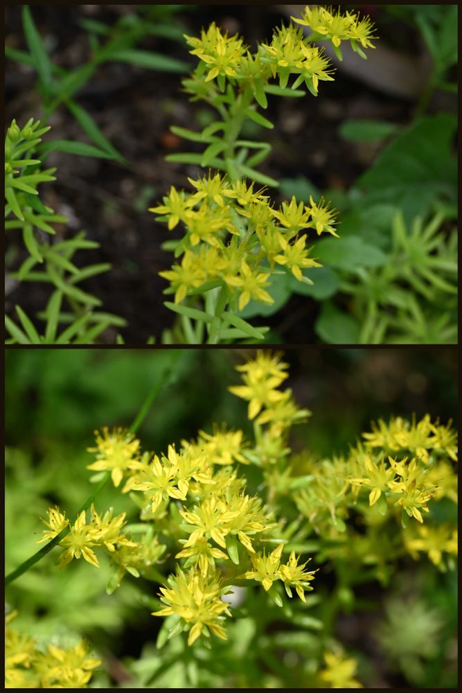 茎の先端が平らな集散花序となり、マンネングサに似た多数の黄色い花を付ける。