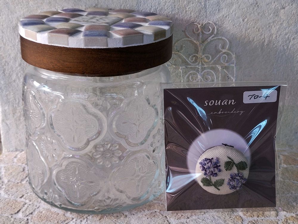 購入後は開場内をまわって「刺繍小物SOUAN」さんでアジサイの刺繍のブローチ、「tokotoco tile」さんで蓋がタイルクラフト(アジサイ色♪)になっているキャニスターを購入(pic. 5)、キッチンカーエリアで餃子とスパイシーコロッケを購入して会場を離れました
