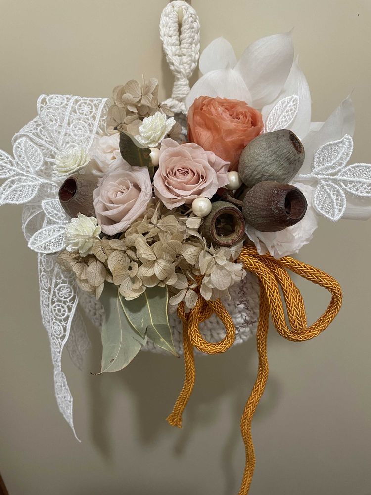 マクラメ編みのバスケットやからプリザーブドがくたびれても小物入れにも使えるし。。