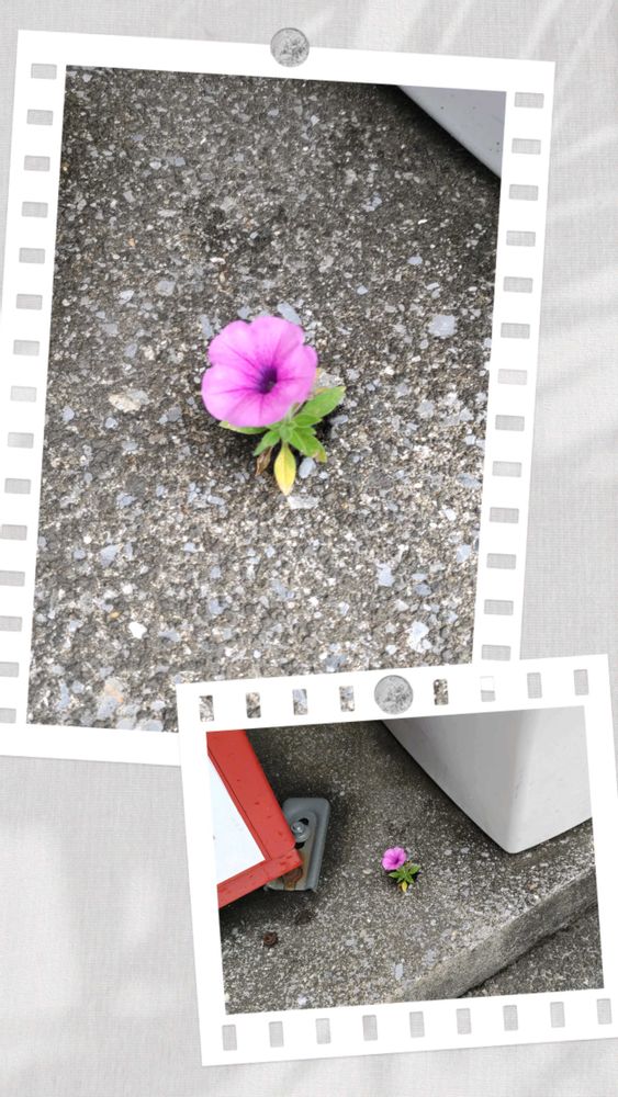 ①散歩中に見掛けたド根性植物、今日のお花のカタバミだと思ってたので投稿しようと思って良くみたら、ペチュニア?どちらにしろ逞しい生命力に拍手👏