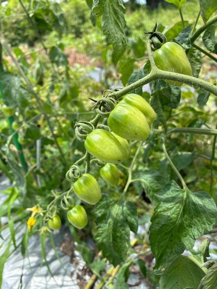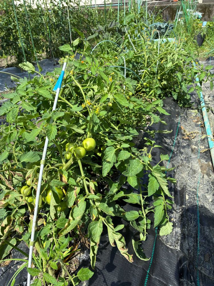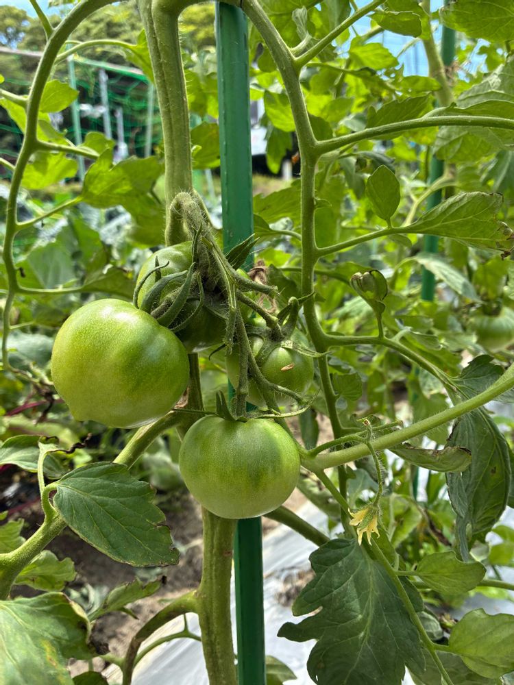 一本仕立ての大玉トマトの摘果、中玉とミニトマトは2〜3本仕立て、調理用でセミブッシュタイプの早生だるまは放任としています。