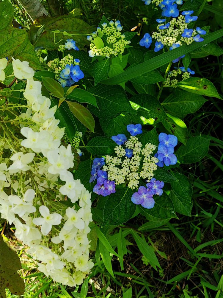 カシワバアジサイと毎年キレイに咲いてくれる品種不明のガクアジサイが今年もコラボしてくれました。このアジサイ、シンプルですが、装飾花が暴れず光を放っているような雰囲気があり、何気にとても気に入っています。あまり背が高くならず、じわじわと広がりながら毎年少しずつ花を増やしてくれている美人さんです。