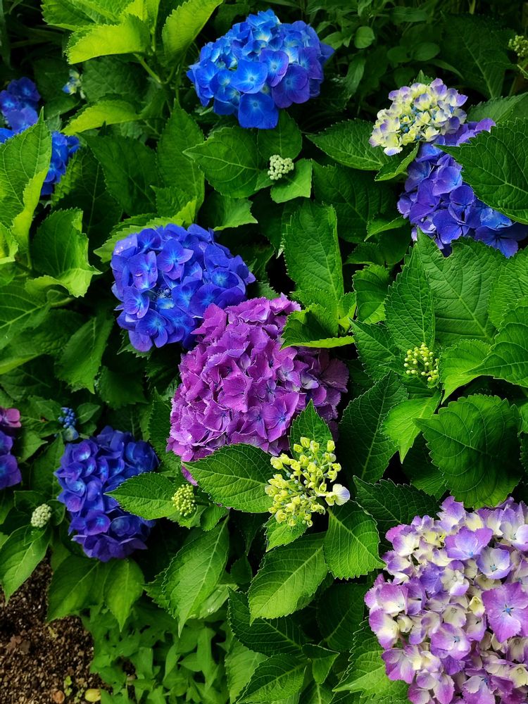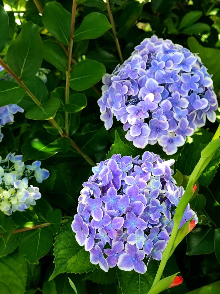 大輪テマリ咲きのマリンブルー(奥)とミューズFアポロン(手前)、毎年どんどん見事になっています。背丈はまだそんなに高くないですが、横に大きく広がってとってもワイドに咲いています。購入した時はどちらも同じような色合いでしたし、同じ場所に植えているのですが、全く違う色に咲きました。マリンブルーの青色は本当に見事です。アポロンはもっと青系になって欲しいので、周りにクエン酸を撒いておこうと思います。ユリとか植えたから肥料のせいでピンクが入ったかなぁ...