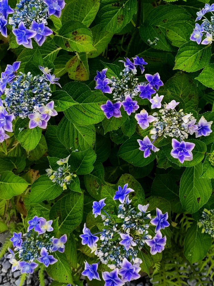 銀河は昔私が母の日にあげた子です。前の家で忘れ去られてたのを救出し、北の坪庭に地植えにしました。北とはいえ、西日が厳しいところでなかなかしんどそうでしたが、やっと慣れてきてくれて花数が増えてきました。若干葉焼けが見られますが、ここまで来ればもう放置で大丈夫。ここは土抑えに溶岩石を敷いているのですが、とても綺麗なブルーで咲いてくれます。比較的コンパクトに高さと幅が同じくらいで茂ってくれるので、紫陽花の中ではかなりお行儀のいい方かと思います笑。ありがとう。