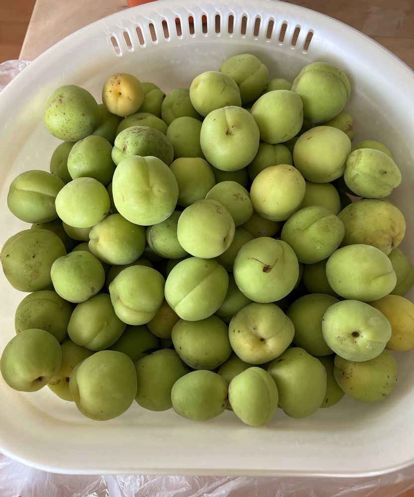 雨が上がったので 朝から主人と脚立🪜を使ってワイワイ言いながら採りました。