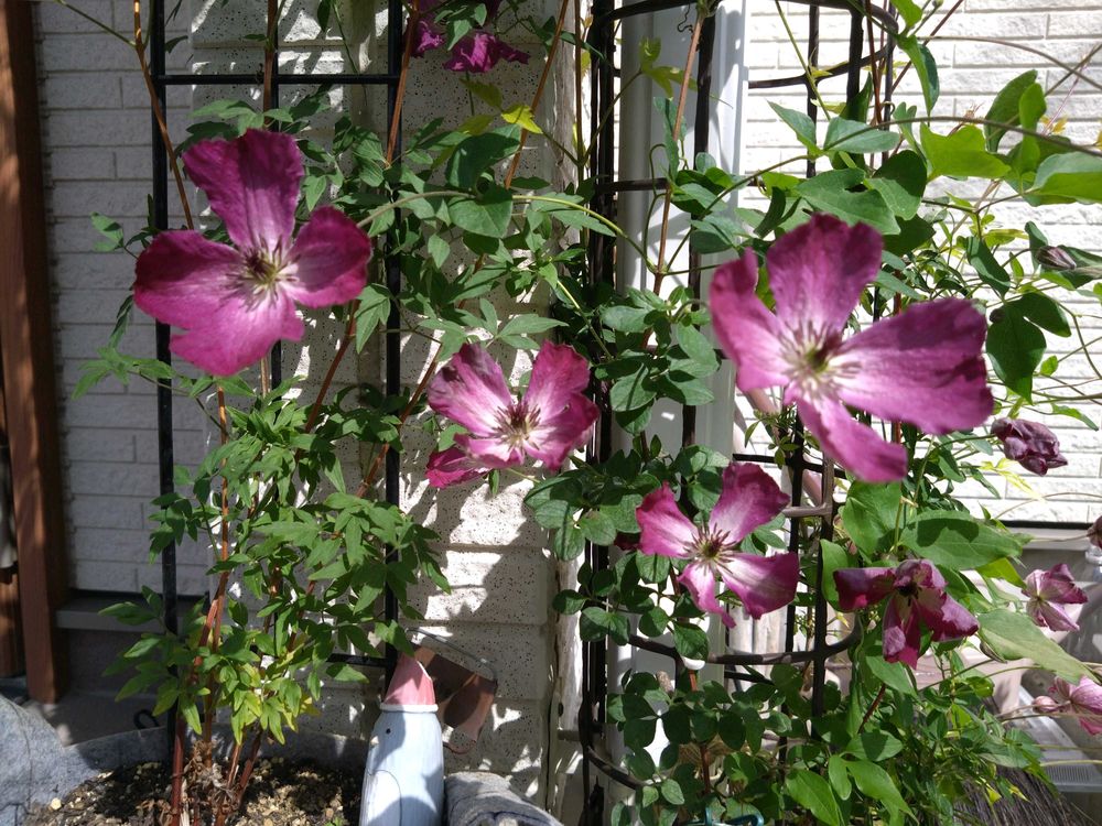 すごく低いのは、一緒に誘引している先輩クレマチス(流星、オブスキュア)に気を遣って?🤭