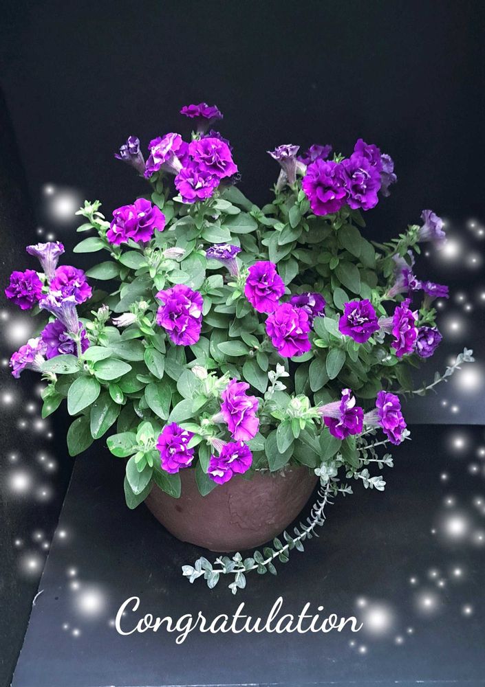 玄関先でモリモリ中の「ポンポン咲くペチュニア小輪八重ブルー」💙💜で、お祝いさせて貰いますね🥰