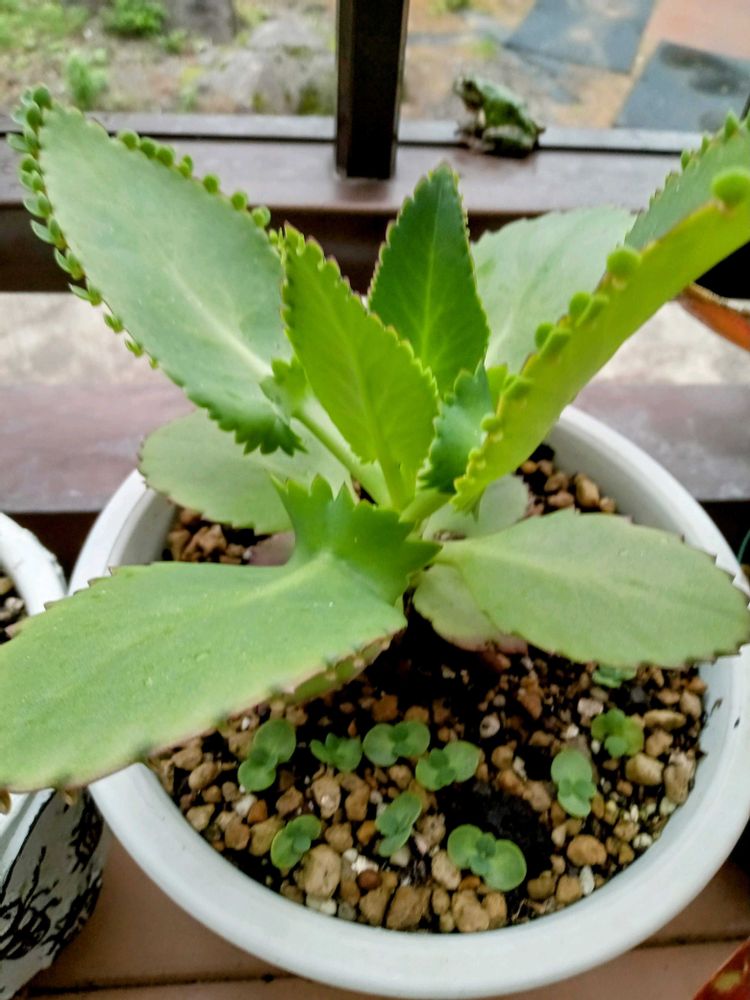 子宝草🌱✨って増える!!やばい!!強風に煽られ、飛び散ってた子供達を集めて土に入れてたら根付いてる😲こうやって命を増やすのか〜🧐カエルちゃんもベランダでウロウロ🤭