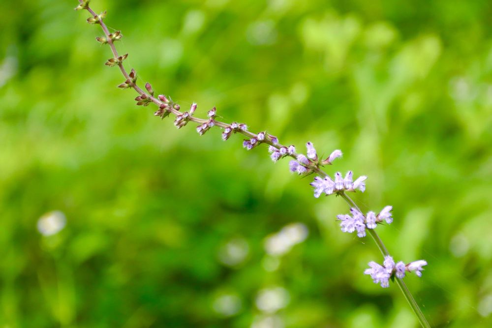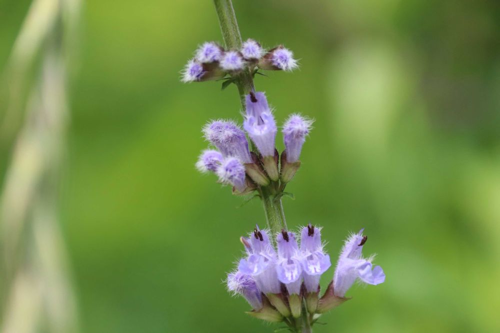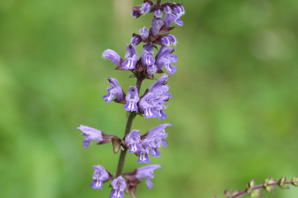 花は青紫色で唇形 やや斜め上を向いて咲き、葯が開いてしまうと下向きに曲がるとか。
