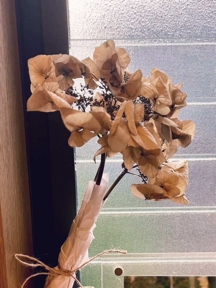 古くから、6月の6がつく日(6、16、26日)にアジサイを家の軒下や玄関などに“逆さまにして吊るす”というおまじないがあるみたい。調べてみると、半紙でくるんでドライフラワーに。