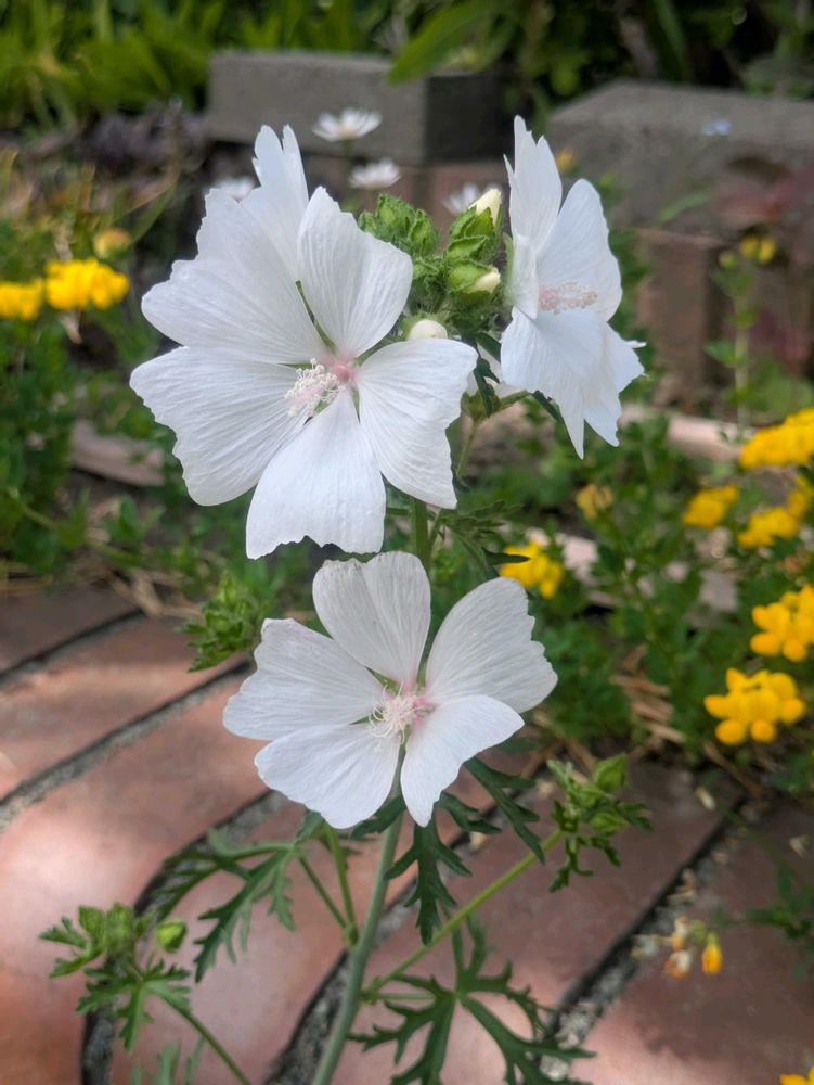 ムスクマロウの白いのは 実は零れ種からので塀の外に咲いてるんです🌿😅庭のなかのはまだ蕾で咲くのはもうちょっとかな😉