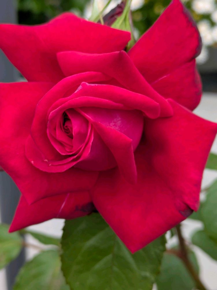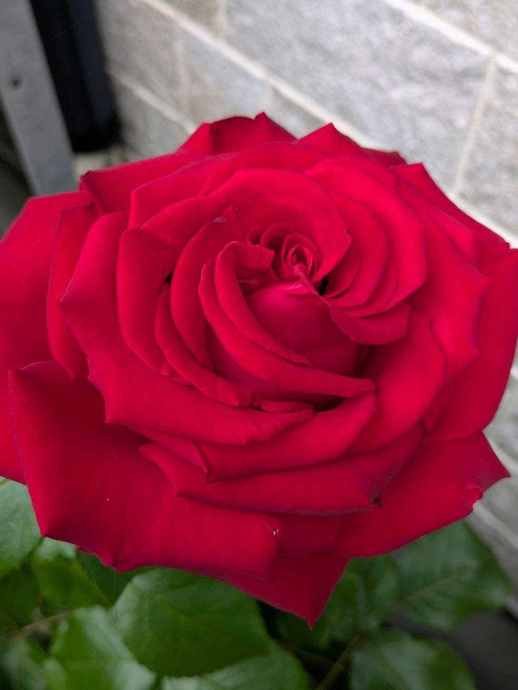 大輪の深紅のバラ、ヘルムート・コールローズ。5本の花枝が立ったのに2本に栄養集中してしまい、巨大化😅ものすごいボリューム✨切り花によくあるあの香です。