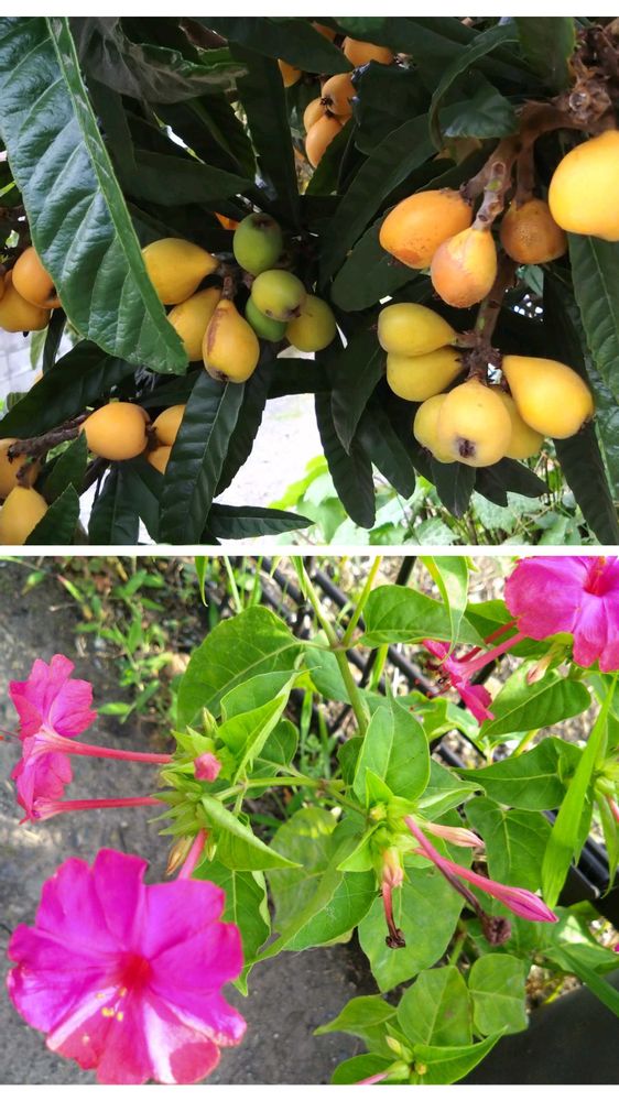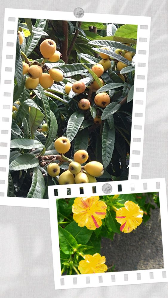 今日の植物は今盛りのビワの実と、今、咲き始めた夏のオシロイバナです。