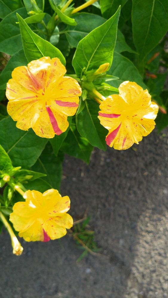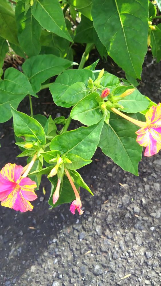 オシロイバナ(白粉花)オシロイバナ科の多年草。開花時期6月〜10月。熱帯アメリカ原産。江戸時代初めに渡来。日本では暖かい地域以外では冬越しが難しい為、一年草として扱われることが多い植物です。花は夕方から夜に咲き翌朝しぼむ一日花です。