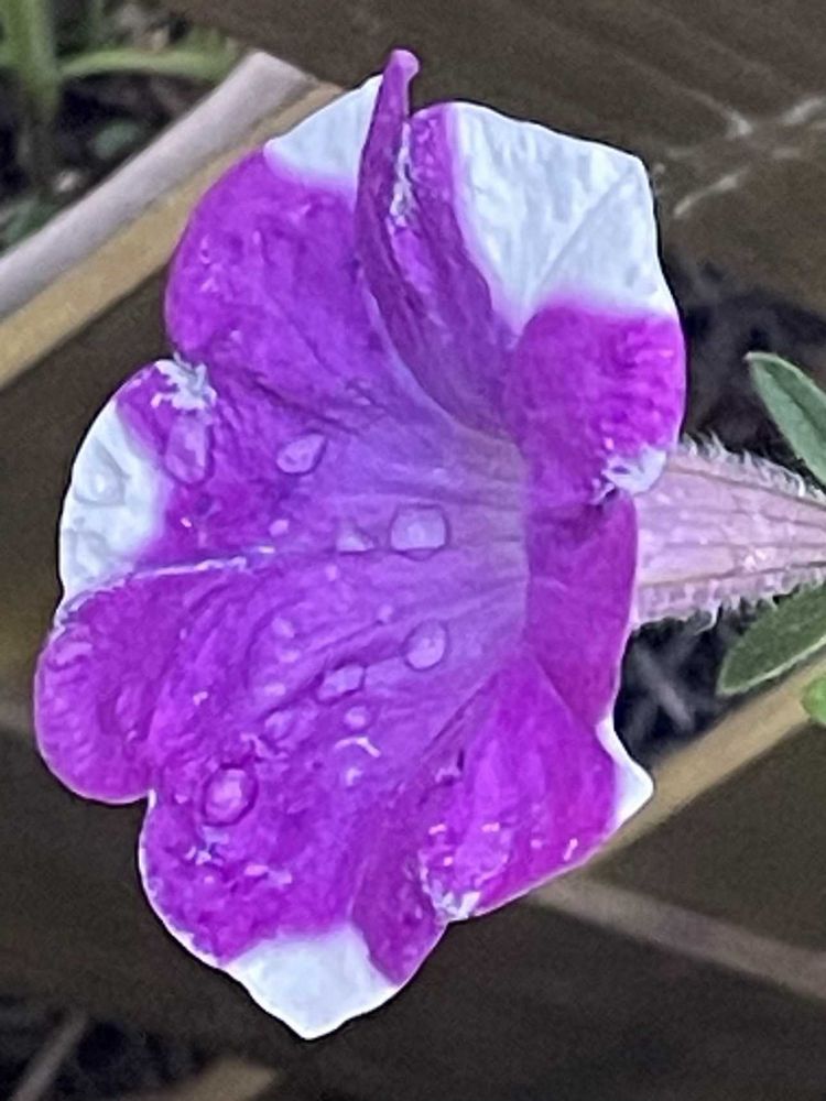 朝は少し小雨がぱらつきました。庭の片隅で咲くペチュニアむ一輪💜