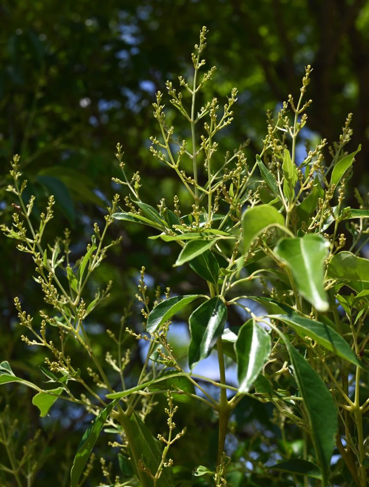 花期は5 - 6月ごろで、枝先や葉腋から円錐花序を出して、緑色を帯びた白い小さな花を多数つける。