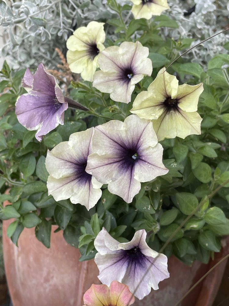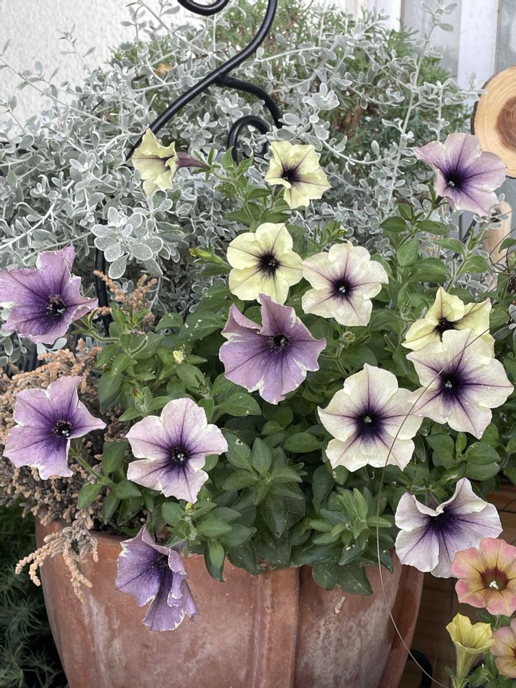 シックなペチュニア、次々と咲いてくれてきれいです💜🤍💛