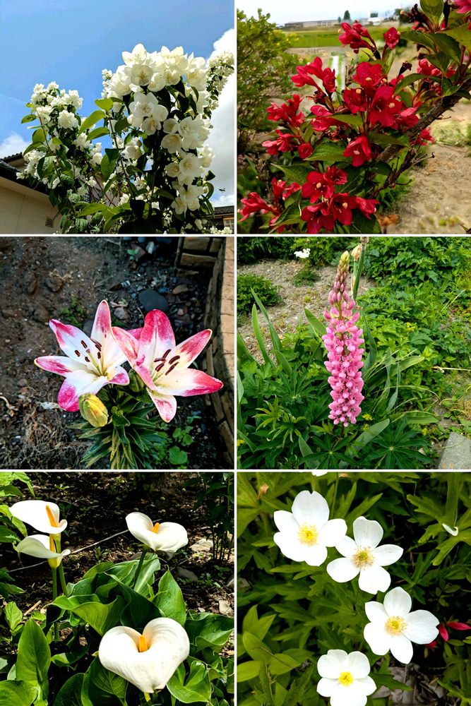 バイカウツギ、ベニウツギ、スカシユリ、ルピナス、カラー、フタマタイチゲ。