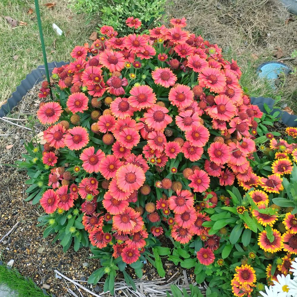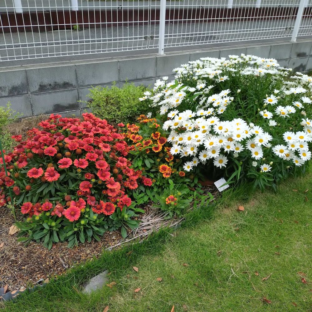 レウカンセマム2苗とガイラルディアスピントップのイエロータッチとスターバースト(真ん中)が植えてあります。