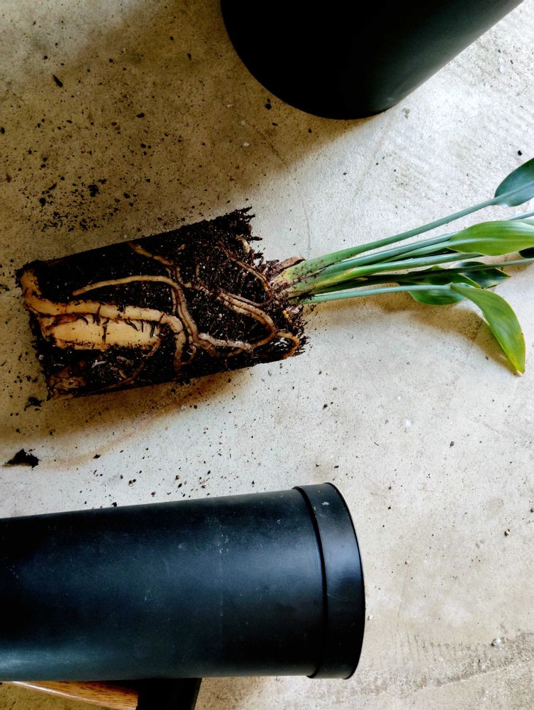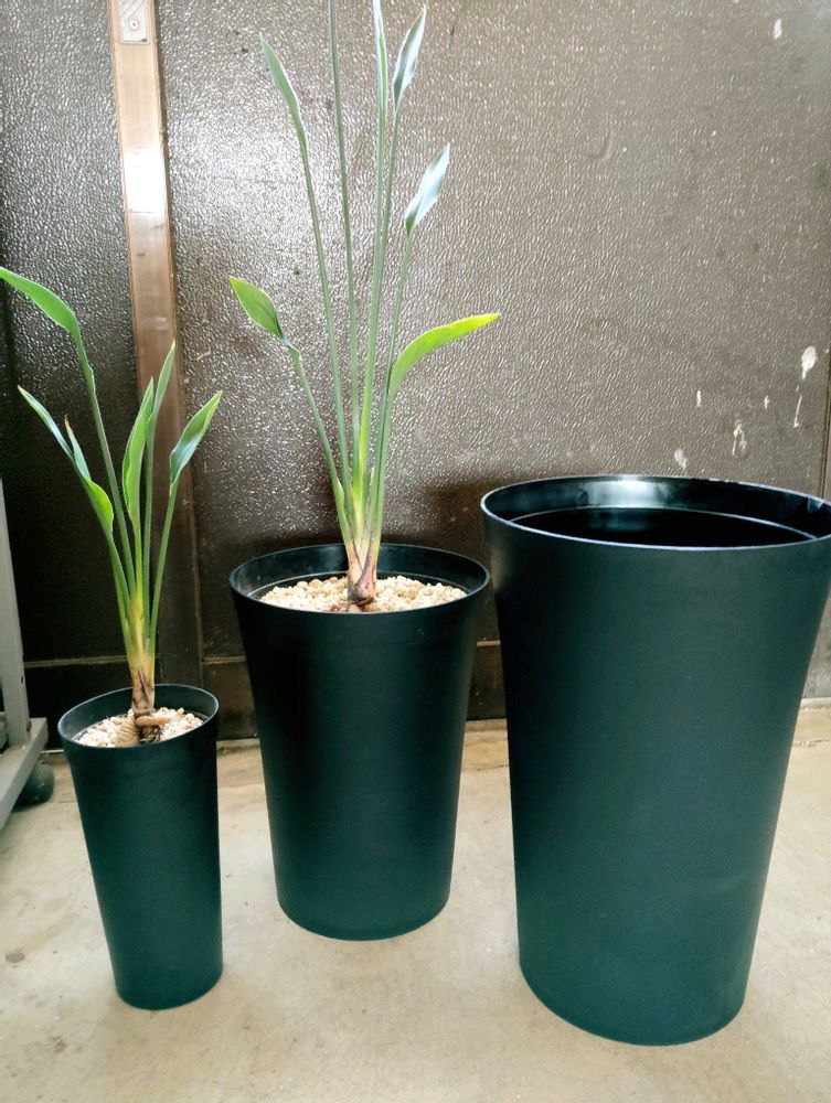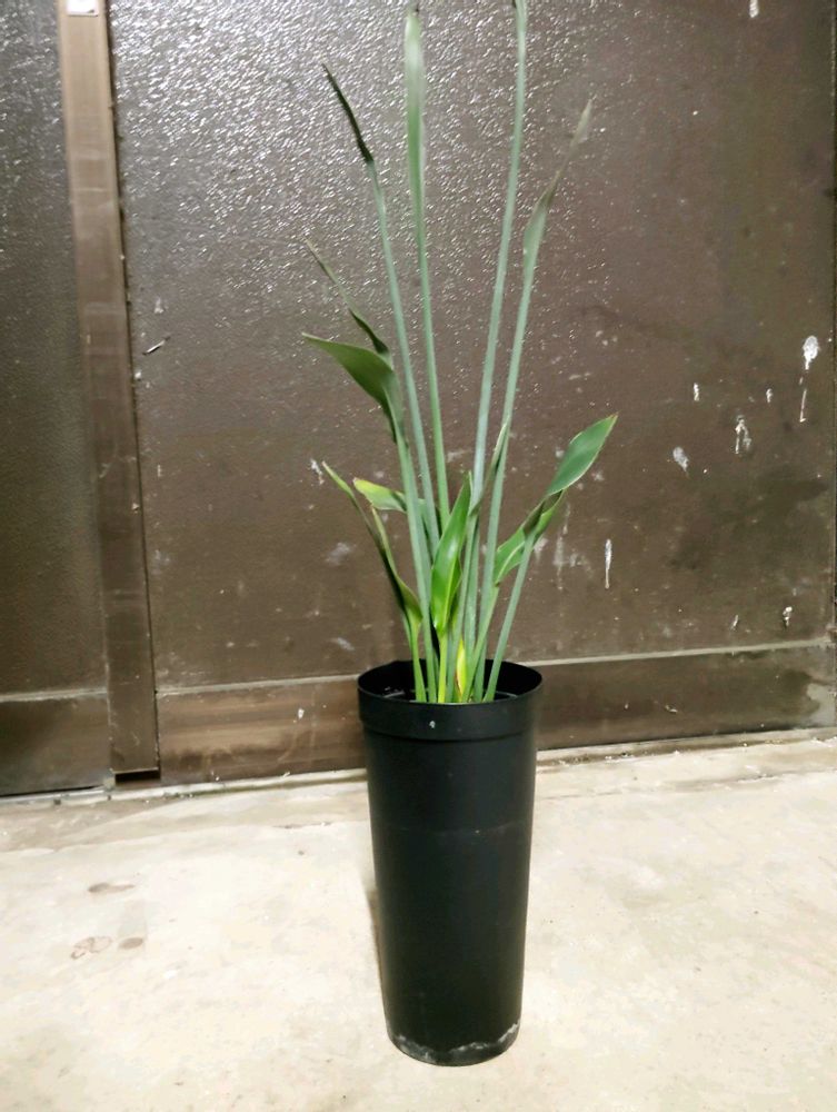 ゴミ箱プランターで植え替えたのはストレリチア・ユンケア(ノンリーフ)です。高めの値段だったけど、二株あることに気づいて、自分を納得させれました!?