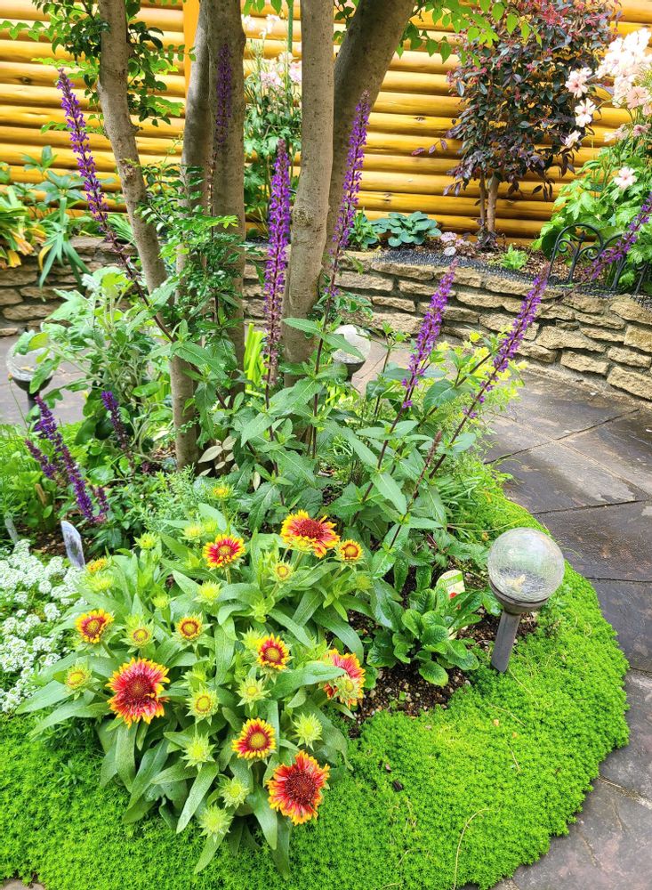 お庭の真ん中花壇〜シンボルツリーとお花たちそしてセダムがグルンとかこんでとっても素敵ですね💓