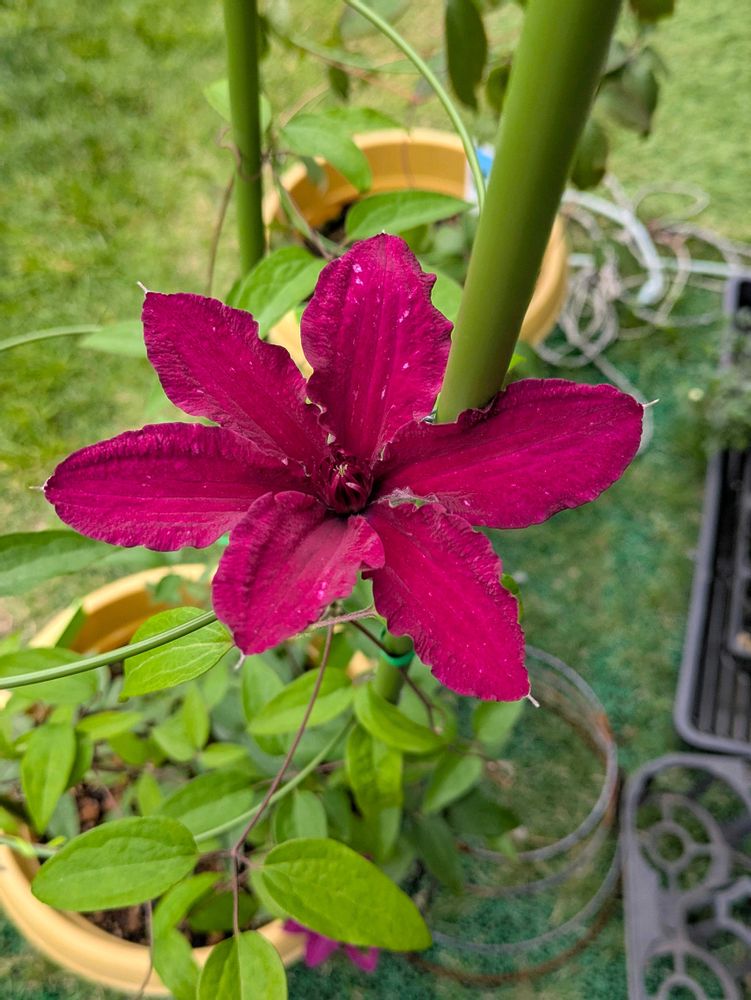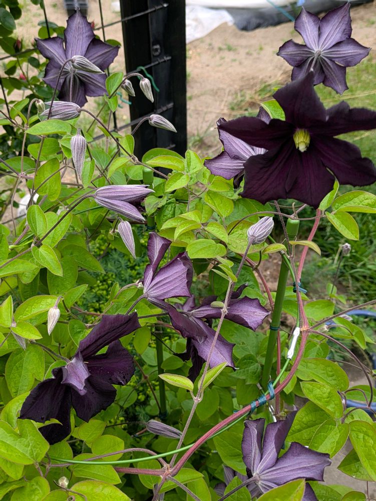ロマンティカは・エレガフミナよりも黒に近い紫。去年は花を2つくらいしかつけてなかったのでほぼお初な御姿✨ああ、こんな感じなのね〜どのつるバラと絡ませたら似合うかな⁉️