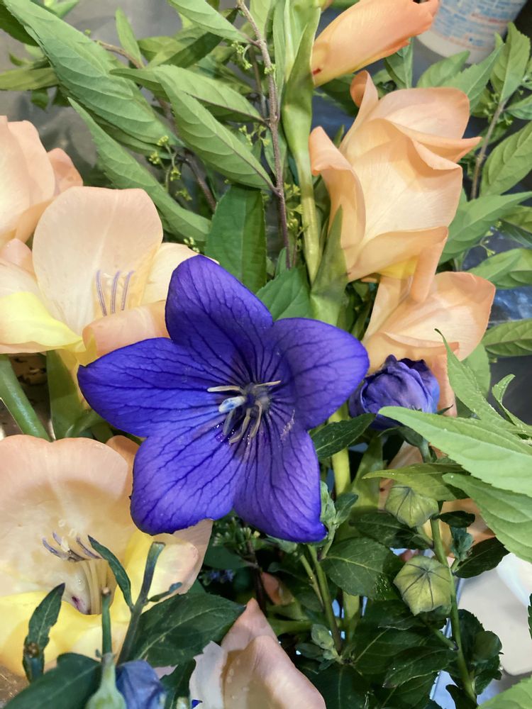 グラジオラスの薄いオレンジとキキョウの濃い紫がよくマッチして綺麗です❤️