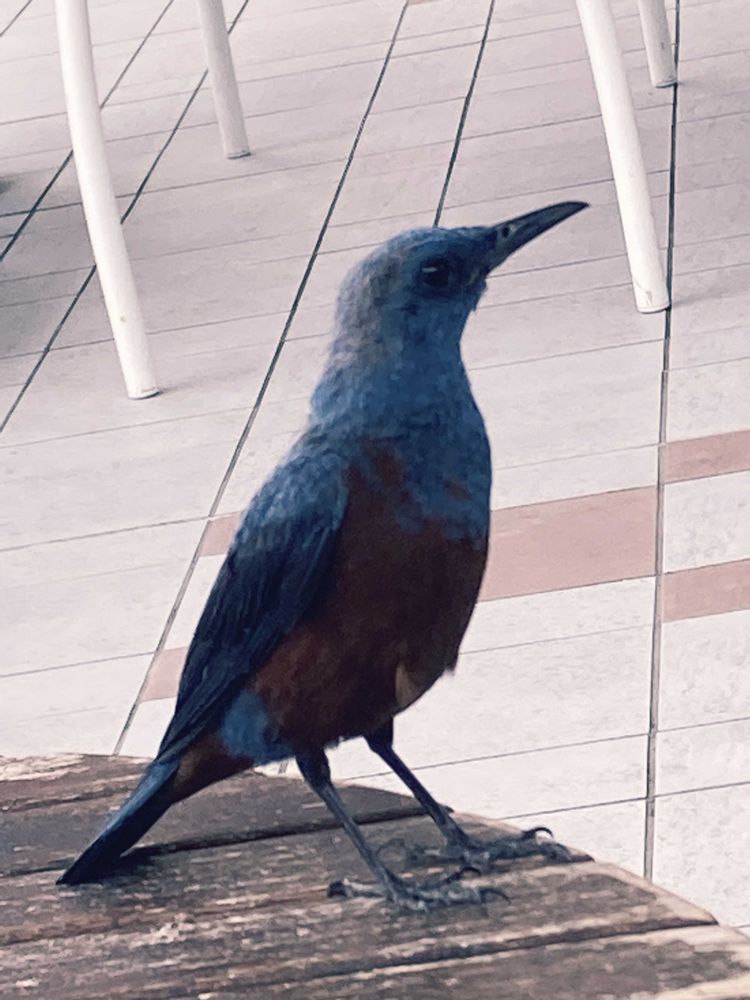 出かけた時にパンを食べていると、イソヒヨドリがテーブルの上に