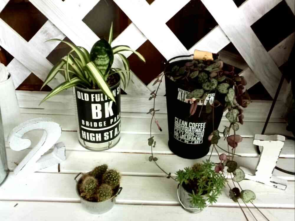 ちょっとおしゃれしたリメ缶にオリズルランとサンスベリアだけか??なんだけ?😜ハートカズラいい感じ😍😍